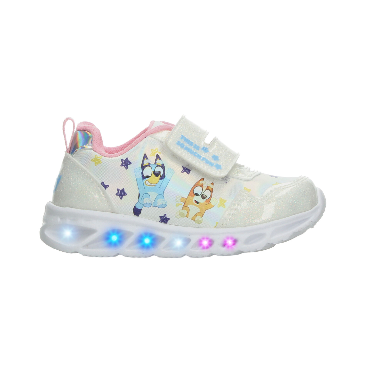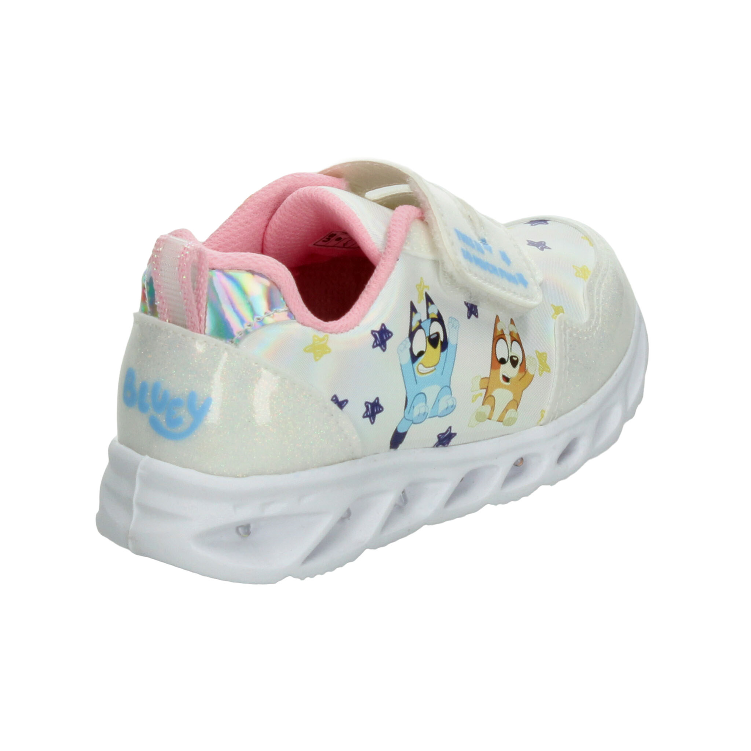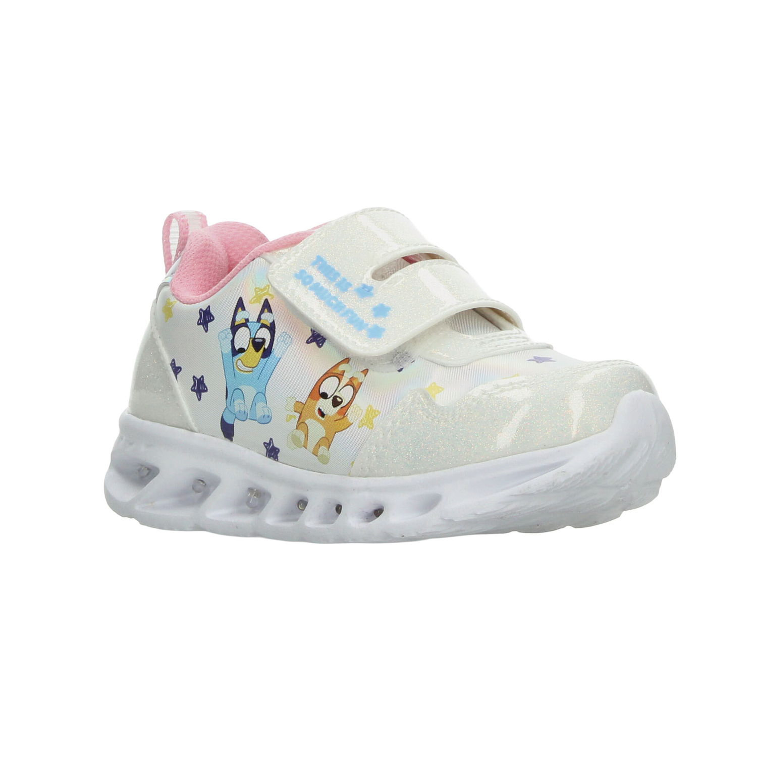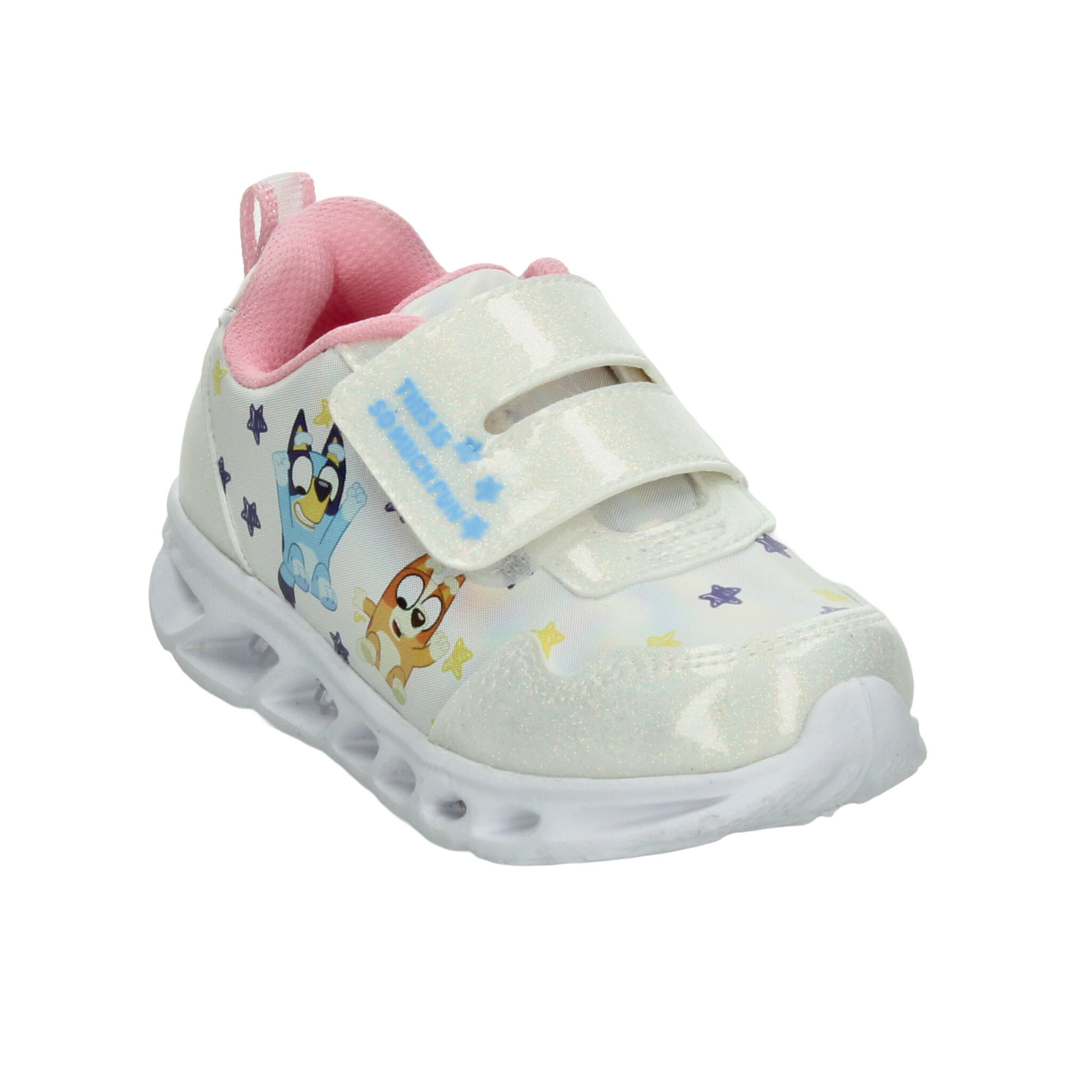 Este modelo de tenis para niña inspirado en Bluey combina diversión, comodidad y estilo en un solo diseño. Elaborado en material sintético con acabado brillante en color blanco con detalles multicolor, luce un estampado encantador de los personajes de la serie rodeados de estrellitas que aportan un toque alegre y llamativo. Cuenta con ajuste de doble velcro para mayor practicidad al calzarse, brindando seguridad y sujeción óptima. Su suela ligera tipo deportiva incluye detalles con luces que se encienden al caminar, lo que lo convierte en el favorito de las más pequeñas. Perfecto para acompañar su día a día con comodidad, diversión y estilo único.