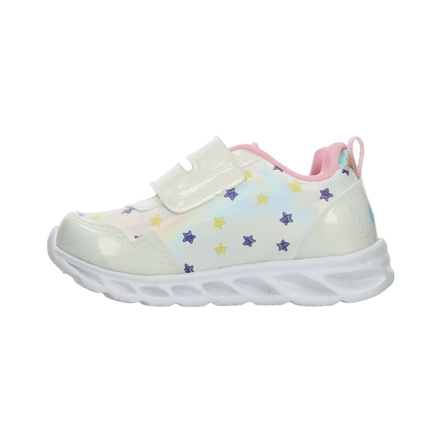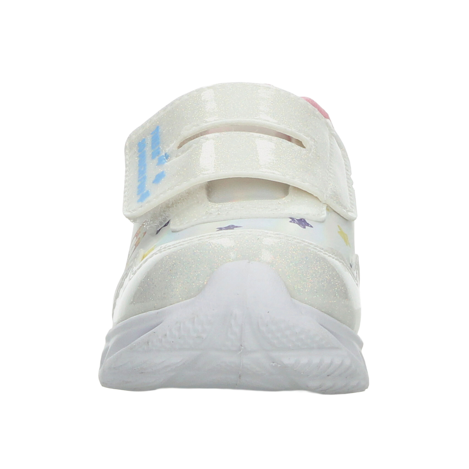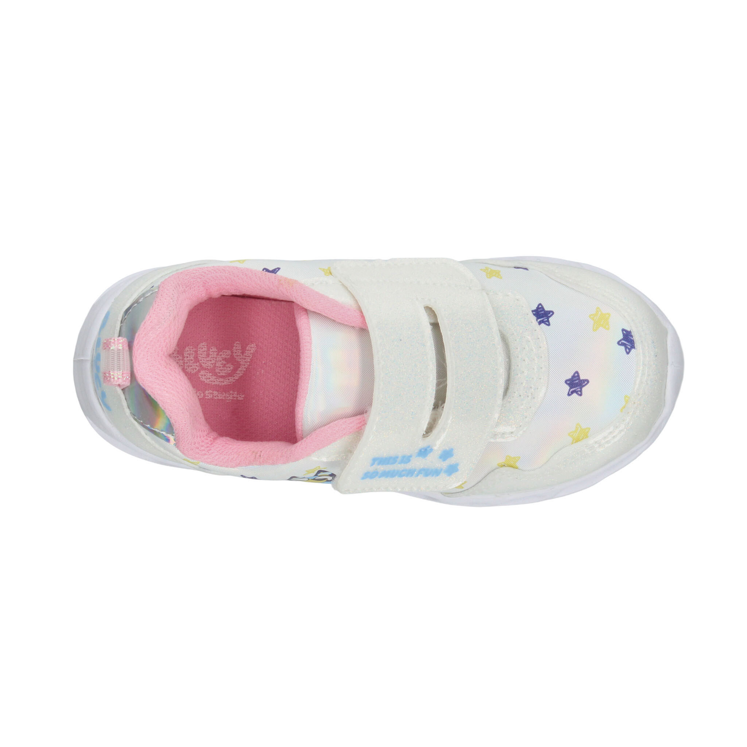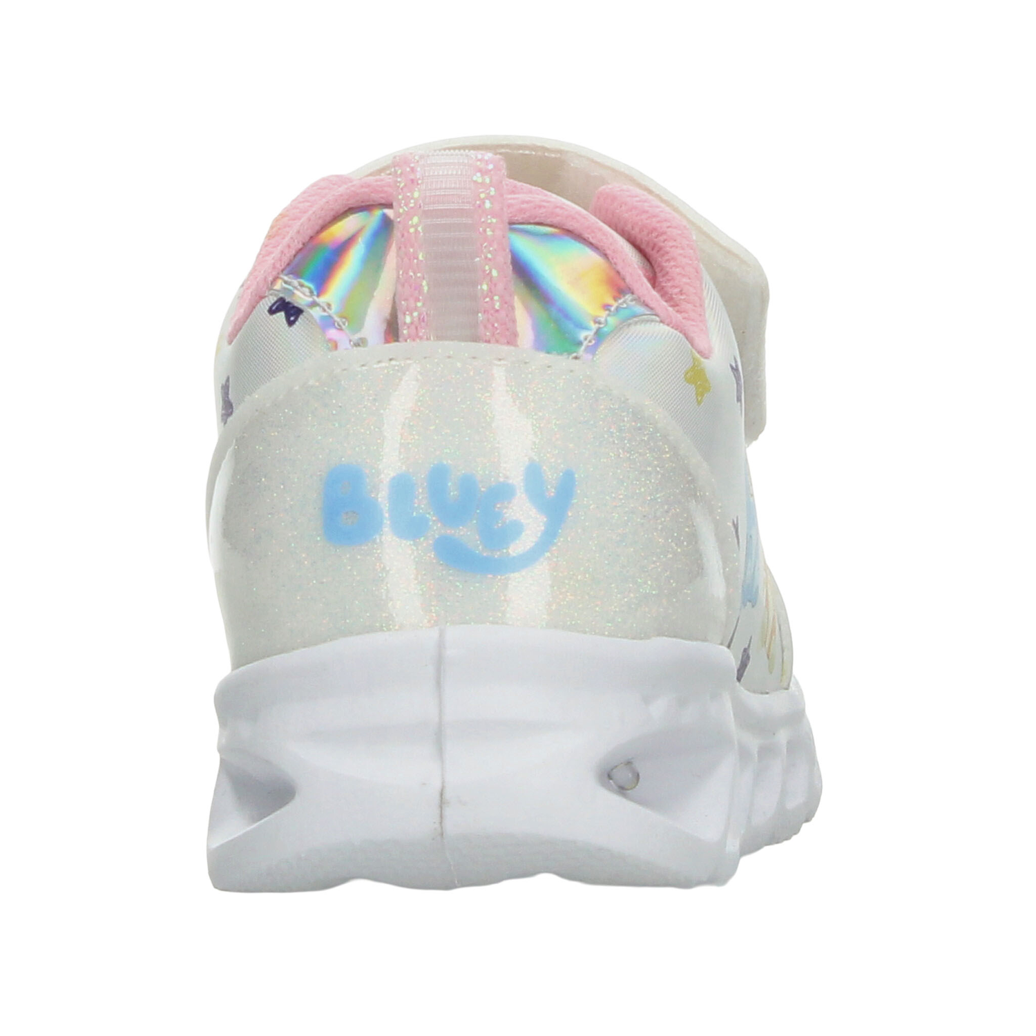 Este modelo de tenis para niña inspirado en Bluey combina diversión, comodidad y estilo en un solo diseño. Elaborado en material sintético con acabado brillante en color blanco con detalles multicolor, luce un estampado encantador de los personajes de la serie rodeados de estrellitas que aportan un toque alegre y llamativo. Cuenta con ajuste de doble velcro para mayor practicidad al calzarse, brindando seguridad y sujeción óptima. Su suela ligera tipo deportiva incluye detalles con luces que se encienden al caminar, lo que lo convierte en el favorito de las más pequeñas. Perfecto para acompañar su día a día con comodidad, diversión y estilo único.